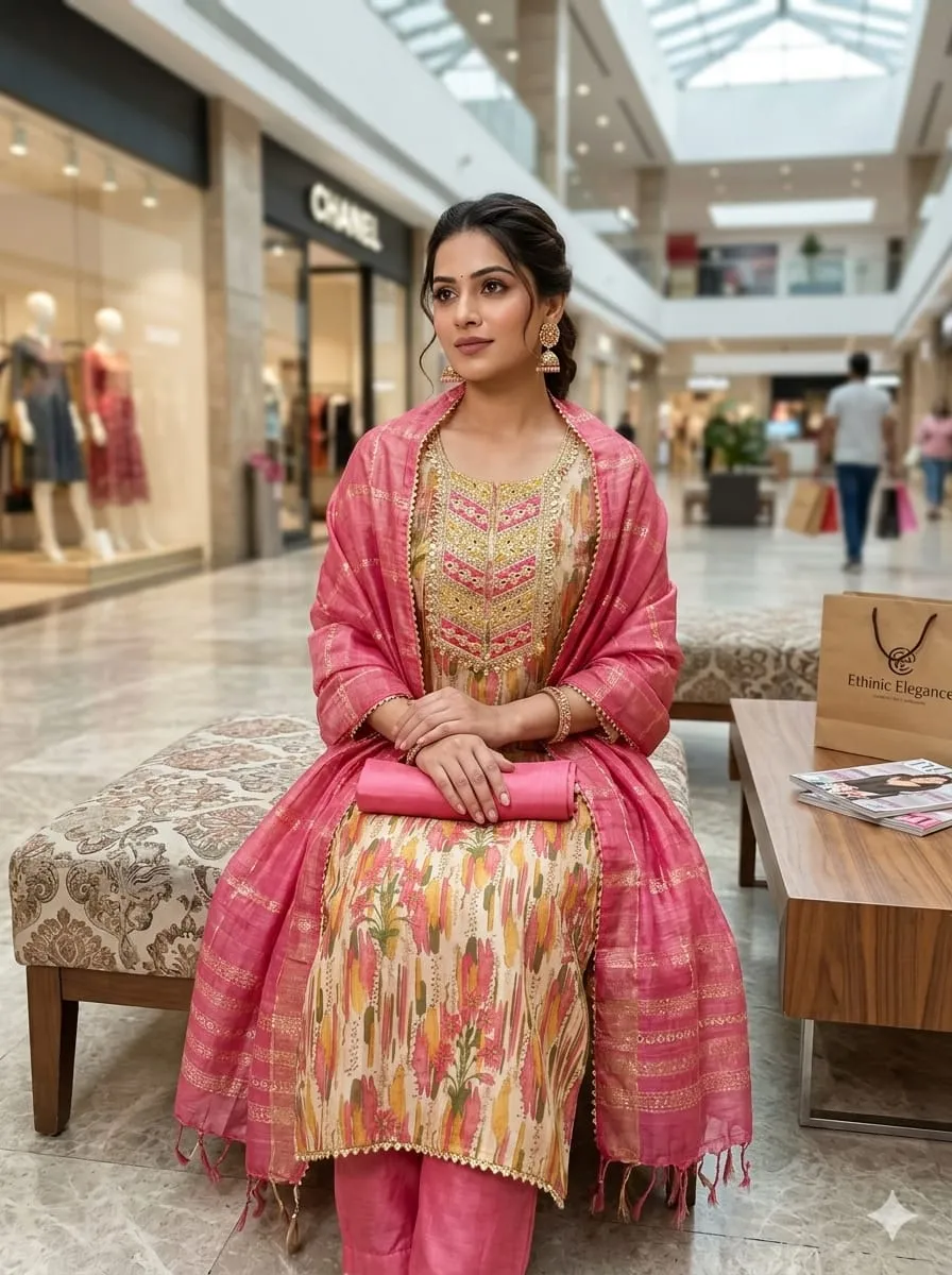 - Top: Simmer Silk Digital Print Kadding Sequence Work