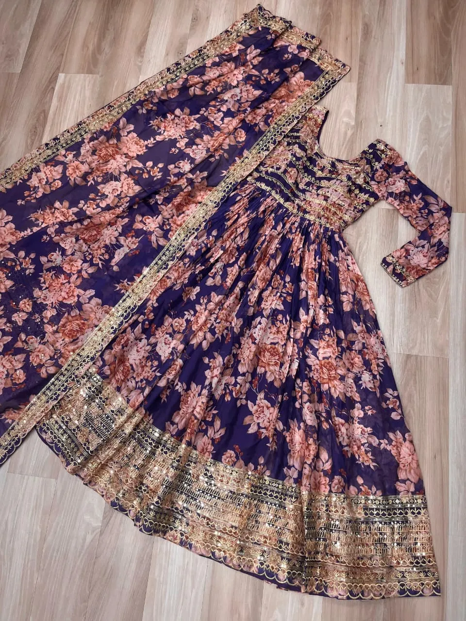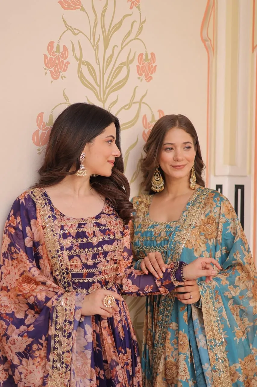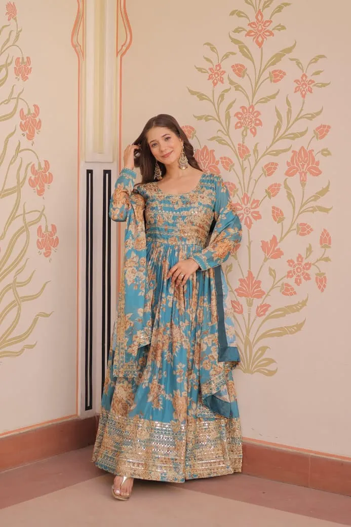 - Gown: Russian Silk Digital Print With Embroidered Sequins Work