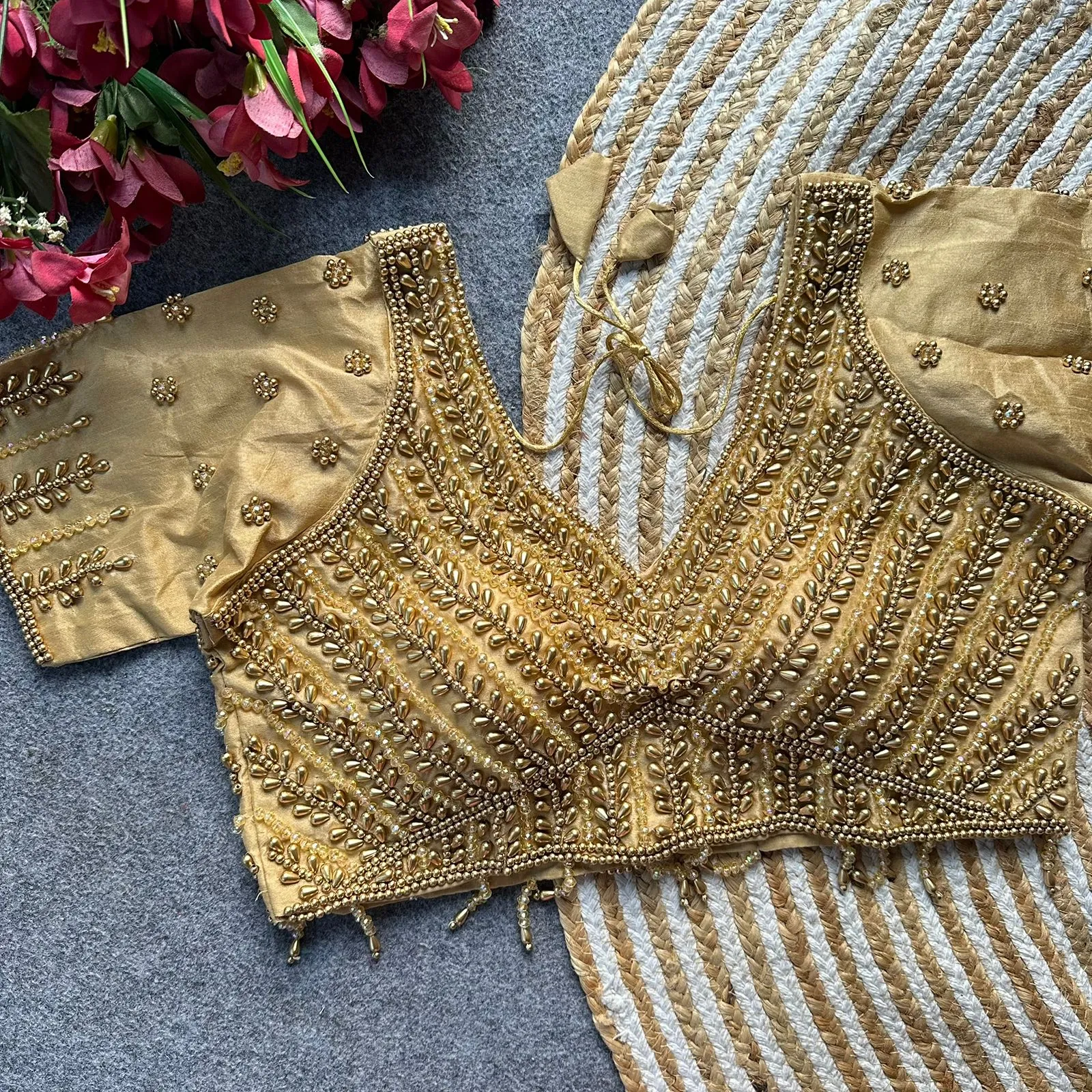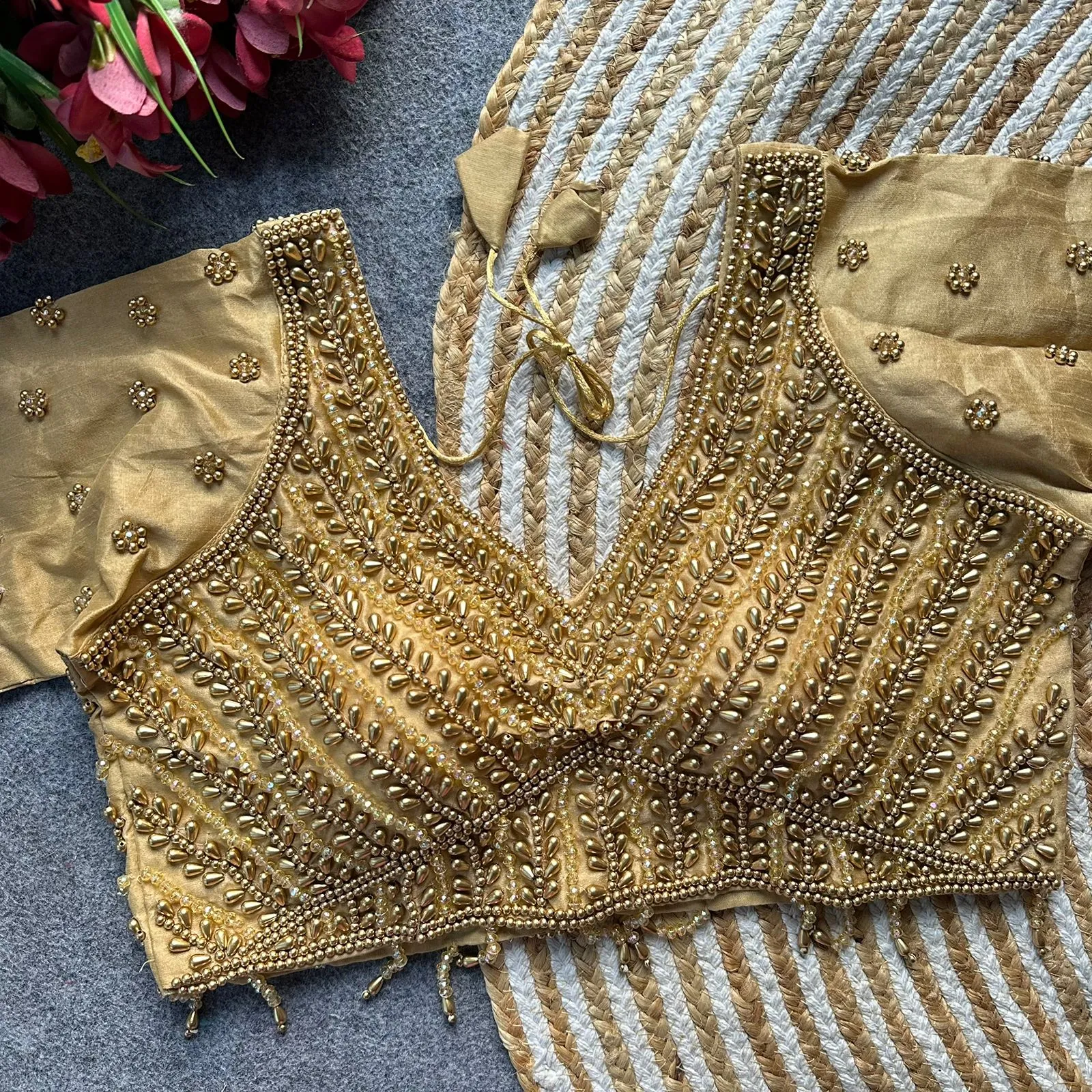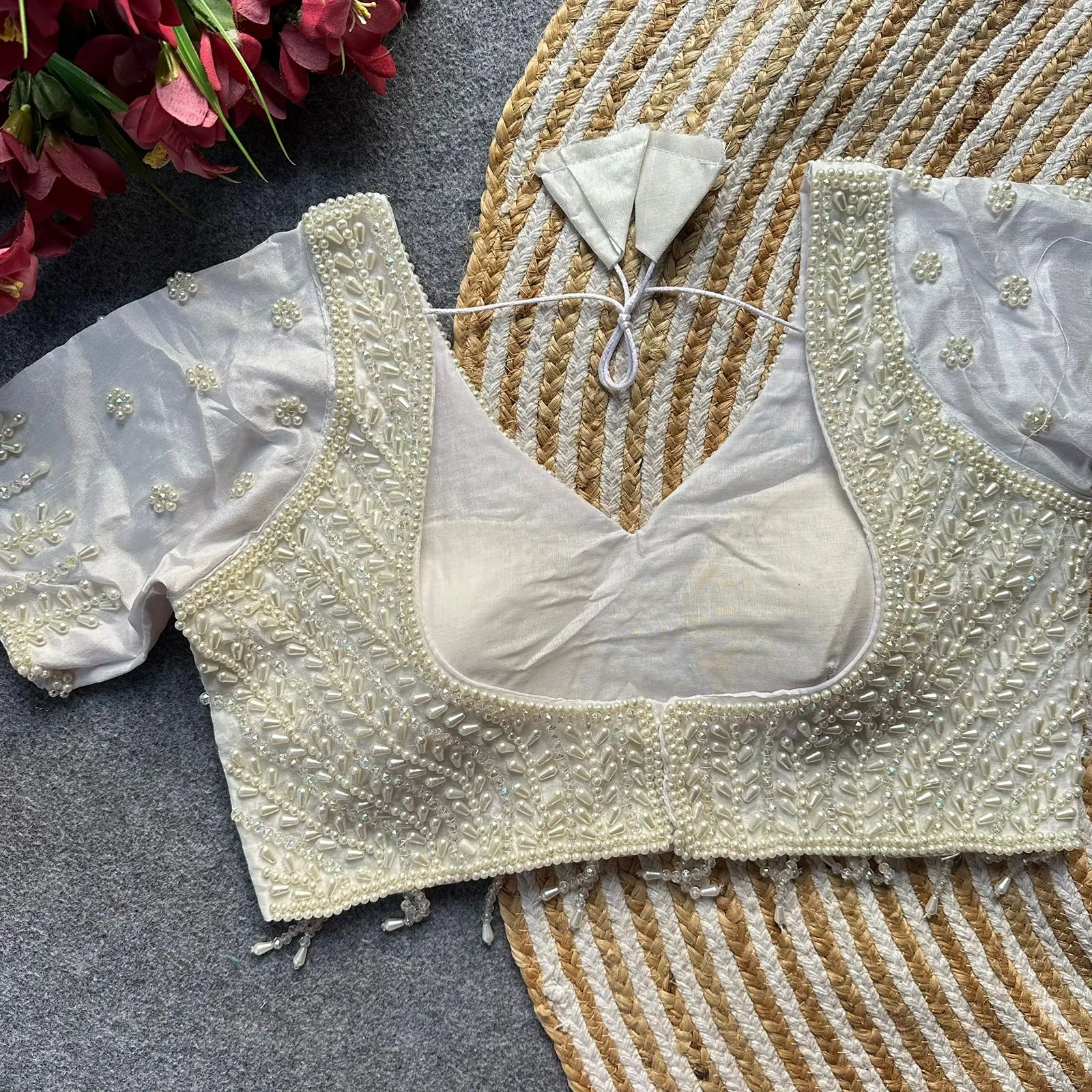 • Blouse Fabric: Pure Silk With Handwork Pearl, Moti, Beads, And Crystal Work (Size: 40)
