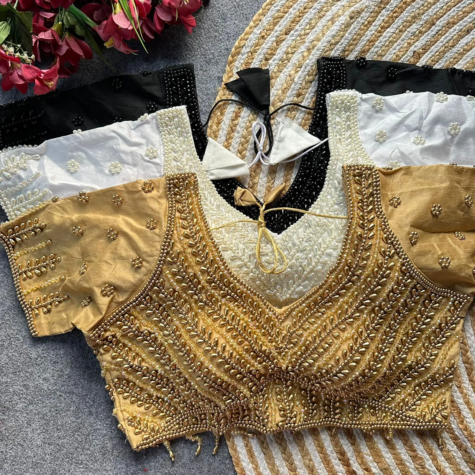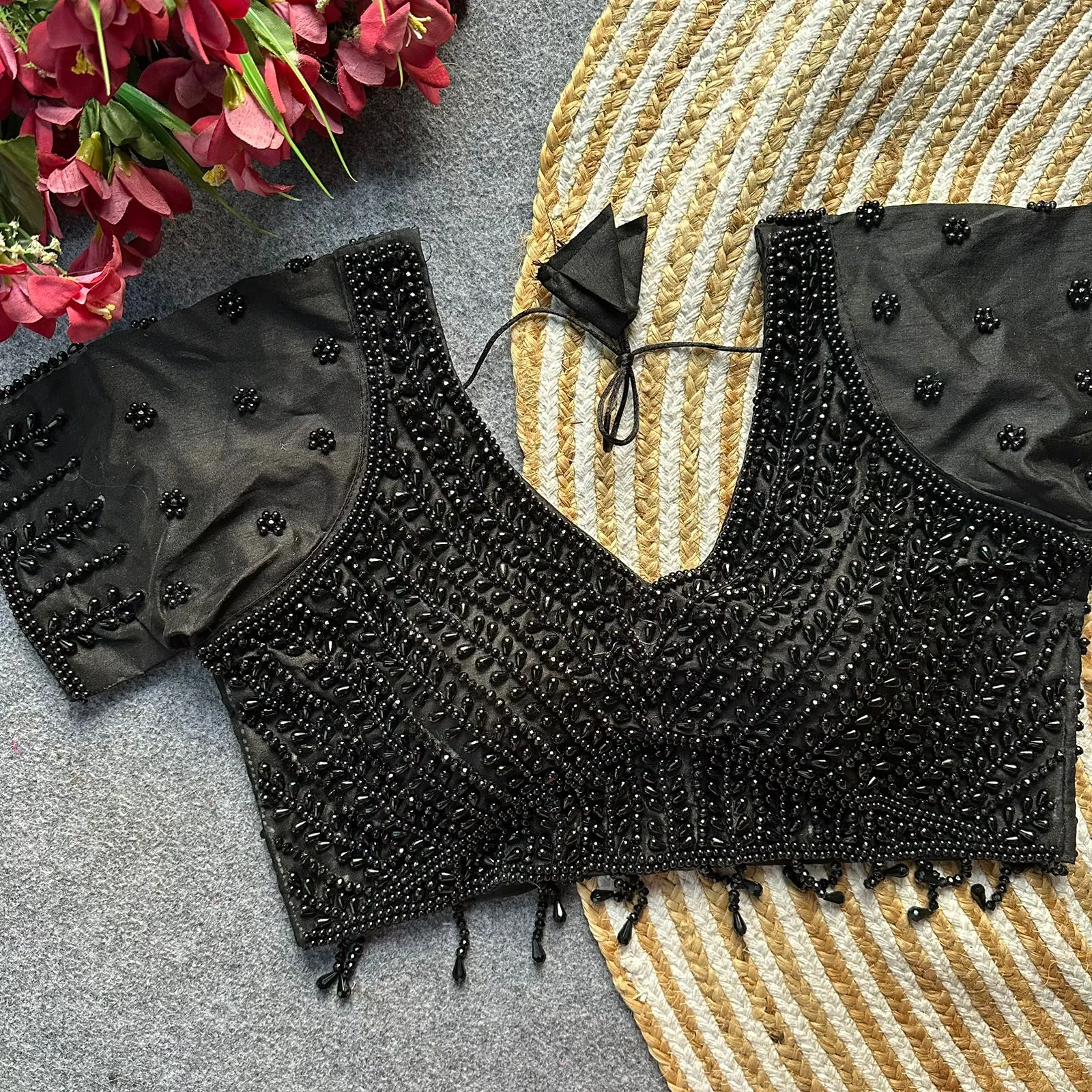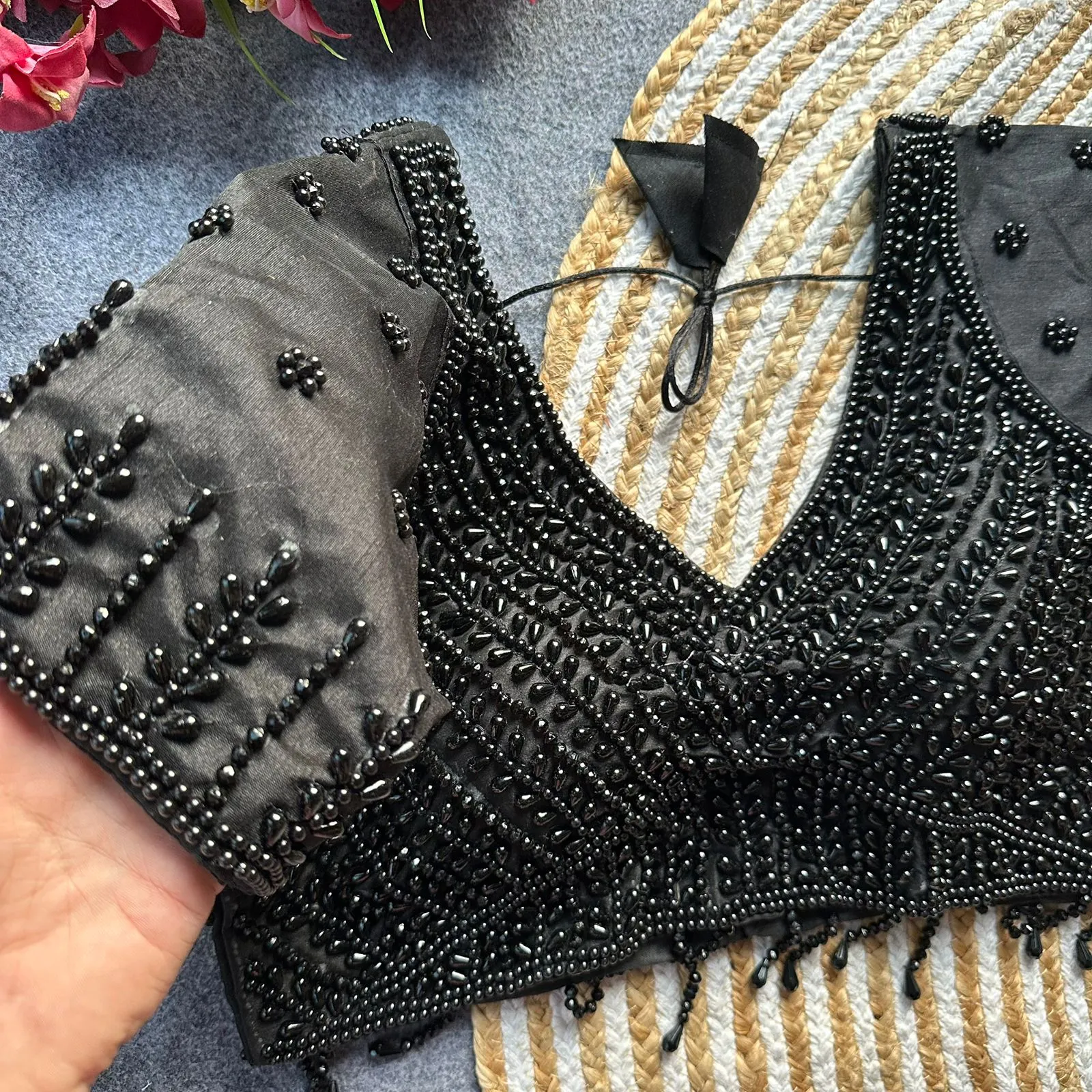 • Blouse Fabric: Pure Silk With Handwork Pearl, Moti, Beads, And Crystal Work (Size: 40)