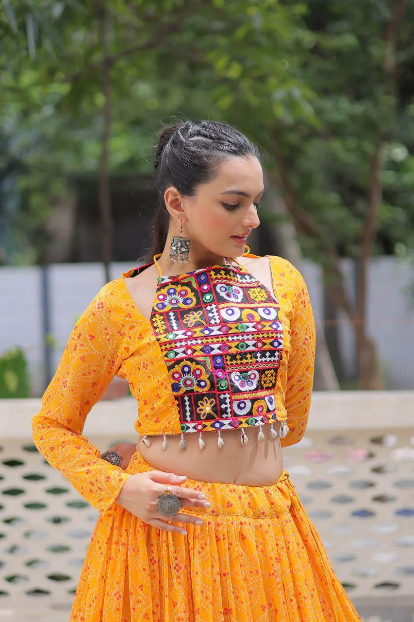 - Top: Faux Georgette Bandhej Print With Gamthi Embroidered Work